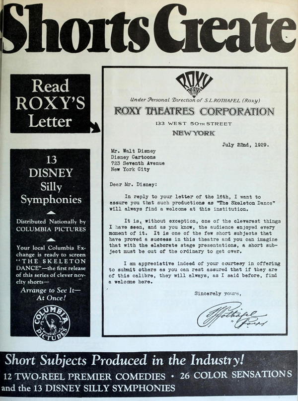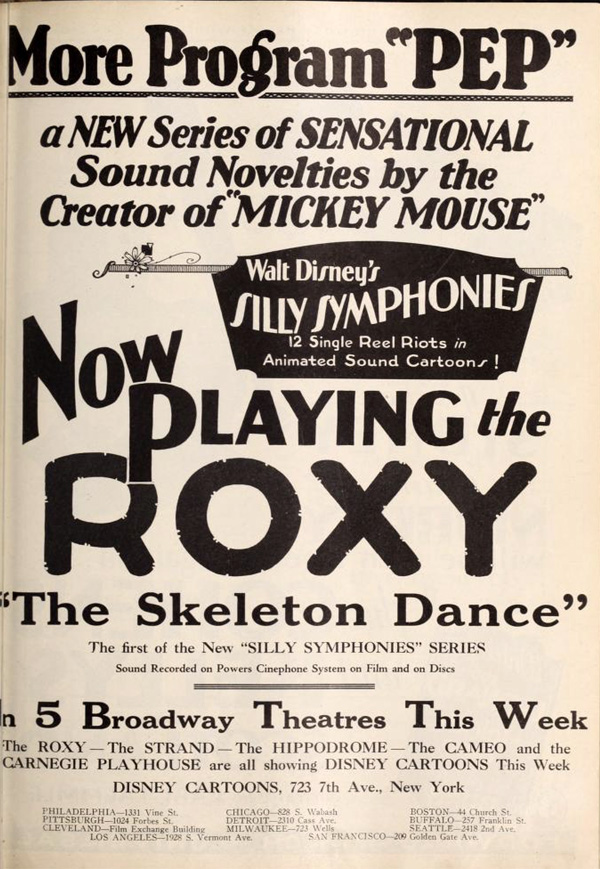 “If the 13 Disney Silly Symphonies scheduled for release by Columbia, maintain the record established by the first, which is entitled “The Skeleton Dance,” then the series will shatter all achievements in both short and feature length productions. The first played at the Roxy and made such a hit that it was re-booked. During the second engagement, the Roxy featured The Skeleton Dance on the marquee. Never before has the Roxy ever re-booked any production whether short or feature length.”