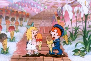 As the children drift off to sleep, they dream of Dreamland, a place filled with every child’s wish. Floating above the clouds, they enter a world where trees grow new clothes for them to change into. From here, they skip through a forest of ice cream cones and then a wonderland of other desserts and candy, and go on to visit a popcorn field, where their popping corn rains from the sky. And then, an entire realm of rolling hills filled with toys.