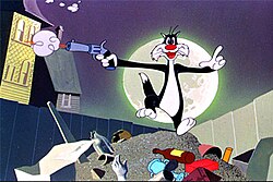Paul Julian reached a peak with Warner from 1945 to 1951. Assigned to Friz Freleng’s production unit, he produced colorful, emphatic background art for many of the Looney Tunes’ outstanding shorts. Some of his notable work includes Back Alley Oproar (1948), Bad Ol’ Putty Tat (1949), and Buccaneer Bunny (1948). In Bad Ol’Putty Tat, an examination of Julian’s work reveals striking use of perspective and canted angles. When the cartoon switches to Granny’s apartment, Julian brings vibrant color to his simplified backgrounds. These talents would serve him well in the next phase of his career. But before departing again for UPA in 1951, Julian would add another hallowed contribution to Looney Tunes history.