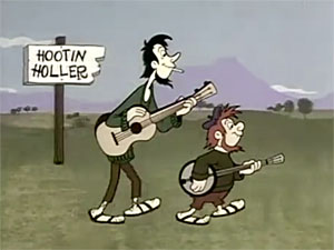 The Snuffy Smith cartoon series often seemed to focus on Snuffy and Loweezy’s attempts to adapt to the intrusions of modern life into their backwoods rural existence. But perhaps no episode more exemplified the clash of two worlds than Beauty and the Beat (King Features/Paramount, circa 1964 – Seymour Kneitel, dir.). Two beatnik musicians seem to have lost their way, and wander into Hootin Holler, one asking the other, “Hey man, what part of Greenwich Village is this?” Barney Google is in need of help, hanging by his hands from the cabin roof because a ladder has fallen out from under him. Snuffy, snoozing under a tree, and the only one within earshot of Barney’s cries for assistance, asks if help can be given while he remains asleep. Barney responds, “No”, and Snuffy answers, “Then I ain’t helpin’.” Barney falls from the roof, and curses out Snuffy. Opening only one eye, Snuffy reacts to the insults, “Sticks and stones can break my bones, but names’ll never hurt me.” The two beatniks happen at the moment to pass within earshot, and are totally “sent” by Snuffy’s poetic observation, thinking it an original composition of beat poetry. They both appear before Snuffy, bowing to him as if the master of his craft, and implore him to “Go, man, go.” Snuffy stands up, and begins to walk away. When asked by the beatniks what he is doing, Snuffy responds, “Great balls of fire, ya told me to go.” The beatniks translate, requesting more poetry from Snuffy, and begin snapping their fingers rhythmically. Sniffy starts to imitate their snapping beat, and recites in rhythm the first thing that pops into his head: “Hickory Dickory Dock, the mouse ran up the clock…” The small beatnik faints, smiling, and the other beatnik informs Snuffy that “Your verse fractured him.” The beatniks decide a shrine must be built to their new king of beat poetry – and so construct “The Most” coffee house on the hallowed hollow. Before premiering their new poetic find to the world, the beatniks realize a change in Snuffy’s appearance is in order. Those threads have to go – that is, go in the other sense, not as in “go” for more poetry. A sweater, black trousers, and sandals become Snuffy’s new wardrobe. Still, something is missing, thanks to Snuffy’s bald head. More hair, and a beard. Fortunately, it turns out that each of the beatniks is wearing hair that is partially fake – so one provides Snuffy with his wig, while the other loans Snuffy his fake beard.