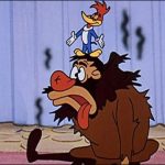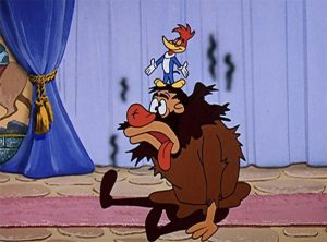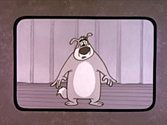 Ballyhooey (Lantz/Universal, Woody Woodpecker, 1/2/60 – Alex Lovy, dir.) finds Woody sitting before a set in his living room, trying to adapt to the experience of watching his favorite TV game show, “Win the Whole Wide World”. The only problem is, it’s quite difficult to concentrate on any game, when the entire proceedings is prefaced by an endless run of commercials, from the show’s sponsor, alternate sponsor, and alternate-alternate sponsor. Woody is burning up with frustration, and is finally forced to stifle the endless jabber by wearing a pair of earmuffs, and falls asleep. The announcer ultimately has to scream for everyone to “wake up” when it is finally time to reveal the prize question: “Who is buried in Grant’s tomb?” Woody is sure he has the answer, writes it on a piece of paper, and races to the TV station to be the first one to provide it. He wrestles with an over-zealous usher who believes no one should be permitted entrance to the show in progress, accidentally punctures with his beak a “puncture-proof” tire advertised by the Goodgrief Rubber Company, but finally makes it to the show. He hands his written answer to the show’s host, who reads it out loud with surprise and confusion: “Napoleon?” The host consults with two old professors with beards who act as research consultants, and the conclusion is reached that the answer is wrong. The correct answer is – George Washington. But Woody wins a consolation prize – a trip South for the winter, all expenses paid. It is not as Woody expected. Woody spends the winter shivering in an igloo at the South Pole, with only a portable TV set inside for entertainment. The game show, “Hi-Ho Eskimo” begins on the screen – but launches into its own series of “words from our sponsors”. “Oh, no”, says Woody, pulling out a pistol, and shooting three holes in the TV screen. The host falls and disappears out of the picture frame. Then the screen image is replaced by a card, reading, “Due to difficulties beyond our control, the picture has been interrupted.”