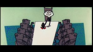 Clampett remembers his roots, having Cecil utter the line. “Eh, what’s up pops?” He also gets away with underscore using a few actual bars of “Merrily We Roll Along”. “Don’t Bugs me, man, don’t Bugs me!”, quips the Wildman, painting a giant carrot and stuffing it in Cecil’s mouth. The final sequence has Van Gogh painting an entire coffee house for himself with a paint roller, then the outlines of musical instruments to provide cool music. Beany, Captain, and Crowy finally catch up, and with a few flings of his paintbrush, Van Gogh transforms all of them and Cecil into beatnik outfits, with dark glasses, goatee beards, and berets. “Oh, well, if ya can’t beatnik ‘em, join ‘em”, concludes Cecil. The cast recite in beat “Twinkle twinkle, little beatnik”, at the conclusion of which Crowy remarks, “Endsville.” An iris out begins, not round, but with the walls of the camera frame closing in from all sides. Van Gogh reaches forwards, stopping the closing sides, and steps out through them, stating, “Man, I don’t dig anything that’s square.” Before he can turn around, the sides have succeeded in closing behind him, shutting him on the outside. Van Gogh bops his nose trying to go back through the now solid blackness, and turns again to the camera, his nose throbbing to a bongo beat, for the curtain line: “How far out can you get?”