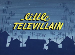 Little Televillain (Lantz/Universal, Chilly Willy,12/8/58 – Alex Lovy, dir.) follows on the same general track, beginning with Smedly the St. Bernard on a bare set in a TV studio. With a melancholy expression on his face, he addresses the viewing audience. “Y’know, folks, some men become great inventors, business typhoons, or brilliant scientists. And me…” Smedly’s speech is interrupted by a purple splat of something tossed directly at him. “…I get hit in the face with pies.” Smedly takes us into a flashback to explain “how this revoltin’ situation got started.” Mr. Stoop of Stoopendous Television has to find a new show for Saturday night, and must read through a mountain of scripts to do it. He orders Smedly to see he’s nor disturbed, or he will be “pink slipped”.