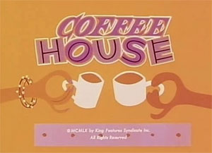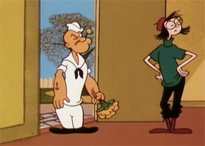 King Features was also prone to satirize the beat generation. Coffee House (Popeye, circa 1960 – Jack Kinney, dir.) was a last memorable instance of Popeye being out of step with Olive’s obsession with current trends. Olive exchanges her blouse and skirt with the stripe for a pant suit, turtle-neck sweater, beret, and round spectacles. Her hair comes down instead of being tied up in a bun. When Popeye rings at the door, she addresses him in beat talk. “Enter my pad. Gimme the hug, big brain.” Popeye appears in shock. “Olive, speak to me. I better call the doctor. Has you had it long?” Not cool. Olive is not only nonplused, but expected someone else – who makes his arrival driving a motor scooter through the door, knocking Popeye down. Bluto (again renamed Brutus for television, but we’ll call him here by his right name) is also decked out in similar garb to Olive, and makes a point of turning his face to Popeye to point out his new invulnerability to Popeye’s fisticuffs, thanks to part of his wardrobe change – “Glasses, Daddy-o”. Bluto and Olive embrace, and begin a string of mutual verbal compliments to each other in classic beat phrases, including “Crazy”, “I dig ya the most”, “You’re the coolest”, “Nutty, frantic”, “The end”, “From outer space, gone.” Popeye’s head looks las if it’s watching a ping pong match, and all he can remark is “What’d ya say? What’d ya say?” Snapping her fingers, Olive responds, “In Squareville we mean, get lost sailor. We’re real gone, but you – go!” Bluto adds, “Yeah, go – like far out”, socking Popeye into a window frame and rolling him up in a windowshade. Bluto then stuffs Popeye into the back of the TV set, emphasizing its “square” picture tube. Popeye tries to block the front door, but Bluto’s scooter runs Popeye over again, and also carries Olive off astride it. Popeye vows he’ll break up that “combo” if it’s the last thing he does.