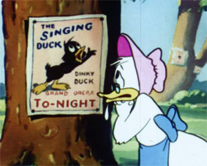 This particular short, Wise Quacks, sort of combines ideas from Donald’s Dream Voice (1947) Disney’s Pinocchio (1940) and The Flying Mouse (1934). The tale starts out as the Terrytoon chorus informs us: “Once there was a silly little duck who wanted to learn to sing. He practiced every chance he got but it didn’t mean a thing”. This poor duck even has the sung narration against him.