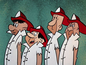 Fred appears home for dinner, dressed in his new fireman’s slicker and hat, announcing his signing up for duty as a “civic minded” citizen. Wilma can’t understand why he refuses to remove his hat at the dinner table, and watches the clock down to the last second, until the bell sounds from Joe’s garage promptly at 7:30. Fred charges out of the house, upsetting the dinner table and Wilma too. “How civic minded can you get?” she ponders. Barney is right behind Fred as they race down the street to answer the call, and Betty complains she almost got trampled in the rush. This goes on for a week, the boys dispersing for the dance studio as soon as Joe announces the daily “false alarm”. Fred and Barney are more than happy for Joe’s cover-up when they meet their shapely female instructors – something the wives would never understand, and even the boys can barely understand themselves. Everything seems too suspicious for the girls, and Joe Rockhead preserves his oath of silence about the boys’ activities by providing the girls with no information upon Betty’s interrogation, claiming all information is classified. Betty finally hits upon a way to outwit them – call in a fire alarm herself, and see just what happens as to their “boys in action”. Joe receives Betty’s call, unaware of her identity, and panics. A real fire? What are they supposed to do? Oh, yeah, ring the bell. Joe sounds the alarm, even though all his volunteers have already left the station for their nightly activities. The other volunteers come running from the ball park, pool hall, poker tables, etc. But Fred and Barney miss the call, hearing only their dancing music. The other firemen jump onto the back of a bright red dinosaur with a ladder strapped to its back and a bell and siren added for equipment (a sort of miniature version of the dino engine first seen in Max Fleischer’s Granite Hotel, which was also regularly seen passing through Bedrock as a part of the original opening credits animation of the series used in the first few seasons but replaced with “Meet the Flintstones” for many years of television syndication). Everyone but Fred and Barney arrive at the Rubbles’ house, and Joe has some explaining to do – especially since in their haste, the crew even forgot to bring along a fire hose). As Wilma and Betty level a threat to spill the beans on the operation to the other wives of Bedrock, Joe breaks his oath of silence, and lets slip that the boys are at the dance studio. The girls arrive there to spot Fred and Barney engrossed in their terpsichore (which looks more like a triple-speed stumble), while their dancing partners look exhausted and ragged. The wives cut in on the surprised boys, and, even though the story sounds fishy even to them, Fred and Barney tell the wives the truth. The wives are pleasantly surprised, embarrassed for mistrusting the husbands, and completely forgiving. All attend the big dance, and, while the boys continue to dance in the same step for every number like tippytoeing stumblebums, the girls remain quite happy at them for being “in there pitching”, and all dance the night away as the episode closes.