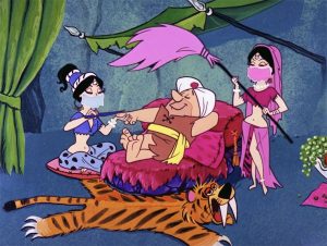 Even Barney gets into the doubles act, in the rarely seen Royal Rubble (12/10/65) – Barney is taken by a pair of Arabian royal assistants, as the believed heir to the princedom of Stoney Arabia. Everyone is ordered to bow to the prince, including Fred, Wilma, and even Betty, who is left behind as Barney is taken to a hotel leased for the occasion by the royal authorities for Barney’s coronation. Fred tries to get inside to save his pal, but finds Barney seems to need no saving, as he dines and basks in the lap of luxury. Things get out of hand when Barney learns that he is to choose 100 or so wives for his royal harem – and Wilma and Betty learn of this development. Fred tries his best to get Barney out of the hotel, but every means of escape is blocked, and abdication is punishable by death. Luckily, the real heir to the throne is discovered in the nick of time to stop the coronation – a double to Barney, but with a slightly higher voice, and a royal scarab to prove his lineage. The boys are set free, and end up bowing to their wives as queens of their humble roost. Pebbles, Bamm Bamm, and Dino, however, direct their bows to Fred and Barney as their kings.