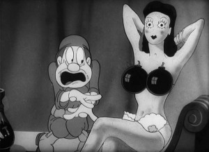 Snafu’s childlike skipping through a war zone at the beginning of the cartoon sets the tone for the rest of the film. I really love what a dolt he is in this particular cartoon; I’m sure it went over great with the largely military audience that wished they could approach life with such reckless abandon. Over the course of the next handful of minutes, Snafu tries to milk a camel with a bomb attached, and enters a brothel, ignoring the many (fake) women there in favor of a piano at the back of the building. The ‘Exploding Piano Gag’ was familiar to me when first seeing this film, and out course the gag is used many years later in Ballot Box Bunny (1950). Funny enough, a version of that gag actually goes back a lot of years earlier, to Van Beuren’s The Fatal Note (1933) the first Little King cartoon.