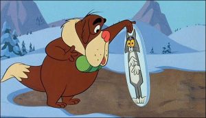 With writing by Warren Foster and animation from Ken Champin, Arthur Davis, Virgil Ross, and others, Snow Business builds the gags well throughout the short, each one topping the other (Sylvester’s “hot hand” doesn’t just melt the snow around the cabin, but thaws the entire mountainside). It’s also fun to see the tables turned on Sylvester, with the mouse pursuing him.