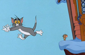As the Saint Bernard looks for the skier who isn’t there, Tom chases Jerry through the cabin. Tom falls off the nearby cliff and rolls into a snowball, crashing down to earth, as Jerry alerts the Saint Bernard.