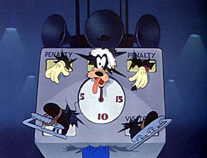 As Hockey Homicide starts, it’s snowing outside a hockey arena, where a sign announces that it’s 60 degrees cooler inside. The two teams about to square off are the Loose Leafs and the Ant Eaters, with the names of the players the same as those of Disney artists, such as Icebox Bertino (animator Al Bertino) and Fearless Ferguson (animator Norm Ferguson), and a referee named Clean Game Kinney (after the short’s director Jack Kinney).