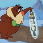 While flipping Tweety up and down in the pan, like a flapjack, the little bird escapes and as Sylvester goes to get him he puts his hand on the hot surface of the stove and then has to cool it off by opening a window and shoving it into the snow outside. The mouse then hits Sylvester on the head with a bowling ball and begins to pull the cat’s leg into his mouse hole, and begins cooking Sylvester’s leg on a rotisserie.