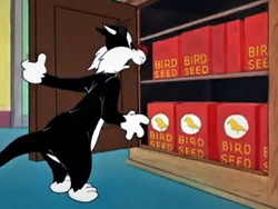 Unfortunately, what he finds is that the refrigerator, the pantry, and the closet are stocked with nothing but birdseed. So, Tweety, being as sweet as Tweety is, wants to help and starts thinking about what cats like to eat.