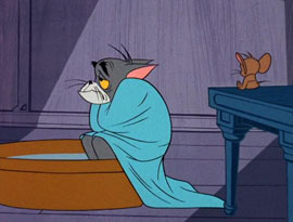 The Saint Bernard rescues the now ice-encased Tom and brings him back with more alcohol, causing Tom to smash into a tree while skating. The Saint Bernard then brings Tom back to the cabin, where he puts the cat’s feet into warm water in front of a fire.