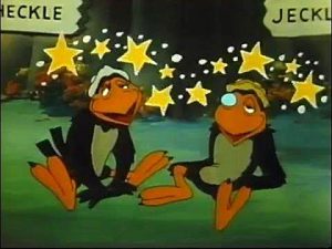 Things are off to an inevitable battle when a slick chick of unknown breed drops her hankie flirtatiously in front of the boys. Both dive for it at the same time, disappear in a fight cloud, then emerge from the dust, each holding respective parts of the handkerchief, torn in half. “Is this yours?” they simultaneously ask. They are both invited to the girl’s home. Both magpies melt from internal heat into respective puddles. The boys try to conceal their plans from each other, acting as if the whole thing was just silly. They turn their separate ways, but each heads to opposite doors of the same tree, where they maintain adjoining apartments. Heckle dons a fedora, while Jeckle puts on a straw hat and monocle, and both add a spritz of cologne. Heckle grabs a handful of posies and attempts to exit his room, only to be tripped up at the doorstep by Jeckle, who swipes the flowers. Jeckle is already carrying a gift-wrapped surprise package of his own, and appears with both gifts to knock at the girl’s doorstep. The door to the home opens, where, to our surprise, we find Heckle already inside, who announces, “She’s not in”, then grabs back the posies, slamming the door to present them to the girl. When Jeckle persists in knocking again, Heckle rigs a wire from the electric doorbell to the doorknob, giving Jeckle a powerful multicolor electric shock when he tries the knob. After hearing the sound of an explosion from the shock, Heckle reopens the door, finding Jeckle nowhere to be seen, but his package still on the porch. Heckle now absconds with this too, presenting it also to the girl. However, the box springs open, revealing Jeckle inside, well and sound, and extending his lower lip to add to the effect of his straw hat, in an impression of French romantic lovemaking a la Maurice Chevalier.