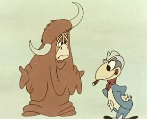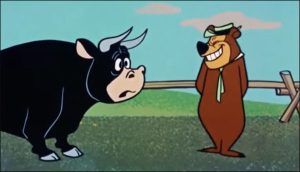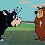 Disguise isn’t the ticket, as Yogi finds out posing as a traveling bush, but unintentionally sneezing away all of his protective foliage. Sharing an old cowhide with Boo Boo, Yogi poses as a cow, receiving compliments and overtures from the love-struck bull. But when the bears try to slip away to obtain their sweet and sticky prize, the bull steps on the trailing tail of their costume, as he remarks, “What’s your hurry?” The cowhide falls, and the jig is up. Both bears run for anywhere the bull isn’t, but the bovine remains right on their tail. Yogi suddenly appears with an old piece of red fabric, of proper size to double as a bullfighter’s cape. “Toro, Ha!”, he repeatedly shouts. The bull races past him in a first charge, his horn tearing away the bottom half of the cape. A second charge halves the size of the remaining fabric again, leaving Yogi with a red hankie to wave. “Nice Toro”, Yogi remarks meekly, as the bull returns for a third charge. This time, instead of taking out more of the fabric, the bull charges off with Yogi, leaving the hankie briefly aloft in mid-air, then settling to the ground. Yogi rides the bull’s horns, until the beast collides with the bee tree. The hive is dislodged, and falls upon the bull’s horns. “Oh, NO!”, reacts the bull. Unseen to our eyes, the bull somehow dislodges the hive from his head, but too late to avoid bringing on the wrath of the resident bees. Yogi, Boo Boo, and the bull all dive in the nearest mill pond to avoid a stinging finish. Yogi and Boo Boo rise from the water first, thinking at least they’ve gotten rid of that bull bully. The bull rises from the water between them. “That’s what you think.” The film should have then closed with the characters racing off in a pursuit to the fade to black – but for no apparent reason, Yogi and Boo Boo are merely permitted to run away, while the bull drains water out of his horns, and remarks with no apparent emotion, “Those crazy mixed-up bears.”