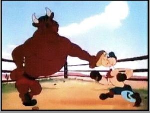 Popalong Popeye (Famous/Paramount, Popeye, 8/29/52 – Seymour Kneitel, dir.) takes the notion of “bull fighting” to a new level, abandoning traditional Spanish rules, and transforming it into a boxing event in the square “ring” of a wester corral. This cartoon-within-a-cartoon finds Western rancher Popeye explaining to Pip-Eye, Pup-Eye, and Peep-Eye (we never are quite sure who is the missing fourth brother in these later films) why eating spinach was necessary to him becoming a rootin’-tootin’ cowboy. In a flashback, Popeye appears as a city-dressed “dude”, seeking the position of cowpuncher at a ranch supervised by Foreman Bluto. Bluto as usual views Popeye as the total tenderfoot, so sets him up in one corner of a square corral, tying on his wrist boxing gloves. “You want to be a cowpuncher “, Bluto reminds him, and introduces Popeye to his opponent – a huge bovine in cape and boxing trunks in the opposite corner, named “Bully Boy”. After a shock take, determined Popeye steps into the ring with his dukes raised. But Billy Boy merely rests one of his gloved hoofs on Popeye’s chin and holds the sailor at calves-length, leaving Popeye swinging wild haymakers that don’t come within a foot of reaching his opponent’s breadbasket. Popeye finally tries an upper cut into Bully’s chin. The blow has no effect, except to pleat Popeye’s drooping arm into accordion bellows. Then Bully hooks his horns into the back side of Popeye’s belt, and uses the suspended sailor as a punching bag for a good workout.