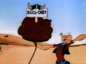 A final sock from Bully loosens Popeye’s belt from Bully’s horns, and sends the sailor sailing through the air, his head landing within the knothole of a rain barrel, while his spinach can sails out of his pocket, landing afloat atop the barrel’s water, with three feet of H2O between the floating can and Popeye’s underwater lips. This proves to be only a temporary problem to our hero, who sucks the spinach can into the water with an inhale through his pipe, and gets his lunch. Bursting forth from the barrel, Popeye’s clothing is magically transformed by the spinach from city duds to a first-class western ensemble. Bluto can’t believe his eyes, and attempts to keep Popeye at bay by releasing another bull from his corral. Using a lariat which has magically come with Popeye’s new outfit, Popeye fashions the rope into a series of four interconnected loops, then tosses the rope over the charging bull’s torso. Popeye gives the rope a tug, drawing the hogtied bull toward him. A left to the jaw, and the bull flies upwards into the air. Another tug on the rope, and it tightens upon the bull, compressing him into a string of five sausages. Popeye catches the string of sausages in a spiral atop the rope loop of his lariat, followed by the bull’s now detached horns, and a small sign which has appeared from nowhere, reading “Bull-oney”. “Free lunch on the house” declares Popeye. And of course, Bluto is vanquished, caught up with by Popeye walking atop a stream of bullets from Bluto’s continuously-shooting six-shooter, and socking Bluto into a batch of branding irons, much in the same manner as in the previous “Rodeo Romeo”.