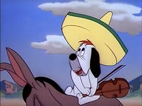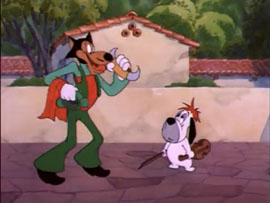 The Kid arrives at the villa and the senorita’s balcony, but Droopy seems to pop up playing his violin every time the Kid begins strumming his guitar. The Kid stuffs Droopy into the Droop’s own sombrero, then tosses the hat away. The hat spins in the air like a Frisbee, and returns ike a boomerang, knocking the Kid’s own hat off a bench and taking its place. So, when the Kid puts on his hat and plays, Droopy appears playing violin and tapping out a few flamenco steps, right on top of the Kid’s head. (The sequence is a bit prolonged in the Kid’s slow-realization of the situation – something Avery probably would have worked on to tighten timing.) The Kid drops Droopy down a well, but the Droop pops out again from the spout of a marble fountain. At last, a first gag has a bit of an Avery mark to it, as the Kid removes Droopy from the fountain by lifting not Droopy from the water, but the spout of water with Droopy still atop it off the top of the fountain. The Kid places Droopy on one end of a teeterboard, and drops a heavy iron weight on the board’s other end to launch him into the sky. It only gives Droopy a rise to the level of the senorita’s balcony, where the senorita plants a kiss on Droopy’s cheek. In one of the better gags (though a bit inconsistent with previous reactions of Droop to a kiss in other cartoons), Droopy remarks to the audience, “You know what? That’s unsanitary”, and sprays his face with a spritzer of antiseptic. It is unknown where Droopy goes by the next shot, as we never see him either step onto the balcony or land back on the ground. Nonetheless, the Kid observes that the teeterboard can get him to the balcony, so stands on the board himself, tossing the iron weight onto the board’s opposite end. He overshoots, and is propelled into the sky, planting a kiss on a passing buzzard instead of the senorita. The buzzard belts him back to the plaza below, landing him back on the board, and propelling the iron weight out of frame to a height unknown. Changing tactics, ad in another gag that would have been Avery-worthy, the Kid grabs a small stack of two boxes, climbs atop it, then keeps taking the bottom box out to stack atop the other box, allowing him to climb atop higher and higher, even though nothing but air is providing a foundation below the stack. He finally reaches the balcony, and puckers up to steal a kiss – as the iron weight re-enters the scene in free fall, clobbering and flattening him under his sombrero.