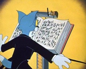 Tom soon spots sigs of his quarry – incriminating footprints leading to a mousehole in the orchestra pit. Coating his bow with a rubbing of fine cheese, Tom, while pretending to play, waves the bow in front of the mousehole, luring Jerry out with the scent. Tom whacks violently upon Jerry’s head with the bow, and briefly catches Jerry up in the bow’s fabric. Tom sadistically presses the bow on his violin strings with all his might, producing some notes through Jerry’s friction upon the strings that sound like wood sawing over the tape recording. But Jerry escapes the torture, by slipping inside the narrow sound holes in the violin’s woodwork. Once inside, he spots the tape recorder mechanism, and sabotages Tom’s plans, by turning the playback speed up to top level. The shrill, chipmunk-speeded violin squeals that emit from the instrument disrupt the whole overture, and raise the easily-provoked fury of the orchestra’s conductor. Tom displays a sheepish grin, holding out the still self-playing violin to reveal its secret, in an effort to avoid blame with an “I didn’t do it”-style pantomime. The conductor is not amused, and does his best impression of Quick Draw McGraw’s El Kabong, smashing the violin over Tom’s head.