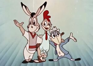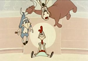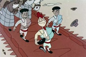 Manolin the Bullfighter (Manolin Torero) (Dibujos Animados, S.A.,1962 – Emery Hawkins, dir.) – I know next to nothing about the background of this series of productions, either made or distributed in Mexico, the few of which have surfaced seeming to have popped up on the internet only within about the last year or so. Considering their relatively small number of available titles, their theatrical-like full main titles, and their relatively full animation (supervised by the great Emery Hawkins), I am presuming these shorts found some life on theatrical screens in Mexican or Spanish language cinemas. Most of the other shorts which have surfaced in the Manolin series (the title character being a Mexican rooster, looking somewhat like a cross between Panchito Pistolas of the Three Caballeros and Disney’s 7up mascot, Fresh-Up Freddy) include a character who does not appear in this one, in the form of a definitely Russian wolf and seem to contain an agenda as soft-sell propaganda to avoid communism and the Russian way. This one, however, is the first I’ve encountered that seems to have no particular propaganda message, and is pretty strictly entertainment. Fortunately, all copies of these films which I have as yet found posted online were dubbed at some time with decently-produced English soundtracks, though onscreen writing in various scenes is not translated by subtitle or otherwise. It might be curious to view one at some point in its native Spanish language, to see how well the original voice casting fared in comparison to the translation.