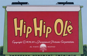 Hip Hip Ole (Paramount, Swifty and Shorty, 11/64 – Seymour Kneitel, dir.) – Monologue comedian Eddie Lawrence (“The Old Philosopher”, “Abner the Baseball”) provides the script for his pair of ever-warring adversaries in their constant battle of words and wits. Shorty has received a present from his wife, intended for use at a party they are attending this evening. Shorty doesn’t even know what the gift is, and attempts to exchange it at Swifty’s costume and novelty shop, for something exciting or good for a few laughs. Swifty informs him the gift is a fine bullfighter’s cape, and attempts to convince him to keep it with his usual brand of fast double-talk. He tries to show Shorty that the gift is exciting, by assuming himself the role of a matador, and having Shorty charge him while pretending to be a bull. Shorty stumbles at the conclusion of the charge, falling flat on the floor. Shorty thinks little of Swifty’s determination to have him keep the cape, asking, “Where am I gonna get a bull?” “Use your wife” suggests Swifty. “A female bull?” observes Shorty. “They’re the best kind”, responds Swifty – “Mean!” Swifty attempts to evoke Shorty’s sense of excitement at the atmosphere of the Corrida, the cheers of the crowd, and the admiration of the beautiful senoritas. “Ain’t ya’ got no romance in your soul?” asks Swifty. Shorty points out a fact demonstrating that romance is dead – “I’m married.” Swifty tries again, handing Shorty the cape and playing the bull’s part himself. “Use your imagination”, says Swifty when Shorty points out he doesn’t look like a bull. “You don’t inspire me”, quips back Shorty.