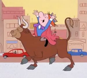 Week two of this special supplement to continue the topic of bullfighter cartoons, begun by Dr. Toon’s pair of articles three weeks ago. We cover today a run of theatricals from 1950 on not written about by the previous contributors, then turn to the first few random examples ot TV cartoons touching the subject but overlooked so far.