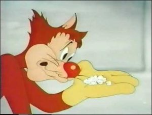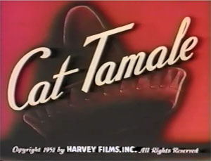 Looks like no one has yet addressed Cat Tamale (Famous/Paramount, Noveltoon (Herman and Katnip), 11/9/51 – Seymour Kneitel, dir.). It’s the usual problem for Herman’s cousins. Katnip keeps them from raiding the ice box. And for at least the second, possibly the third time, one mouse falls victim to the cat – we just never get to meet cousin Louie, the mouse always designated in every film to kick the bucket. This is worse than being the added fourth member of an expedition to the surface in any early episode of “Star Trek”. Herman returns via flight (on the back of a bird) from a vacation in Mexico. (Would it have killed him to bring the extended family along on his trip, rather than leaving them for weeks to starve? For once, Herman really has the death of Louie to place responsibility for upon his own head!) Herman assures the gang that he’s learned all kinds of tricks for dealing with “El Gato” while in Mexico. But Katnip is wily, placing a half-gallon-or-so bottle at the opening of the mousehole, and bottling Herman inside as he emerges. As Katnip tries to suck Herman up with a strong inhale at the bottle’s mouth, Herman prepares a change of Katnip’s diet, substituting for dinner a bag of Mexican jumping beans. Katnip bounces between floor and ceiling, in impacts that strongly suggest imitation of the animation from the twin-magnets sequence from Robert McKimson’s Goofy Gophers epic, “A Ham In a Role”. Herman opens a floor drain, and lets Katnip fall in, then closes the drain lid. However, it’s an easy task for Katnip to slither back in through the piping in the kitchen sink. Herman dives into his miniature suitcase, and when Katnip opens it, Herman has acquired the attire of a miniature bullfighter.