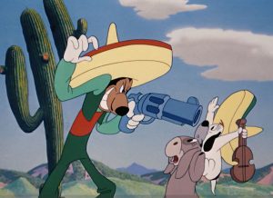 Droopy rides a burro and plays an off-key violin, intending to serenade a beautifil senorita in a nearby villa. He is held up by a bandit known as the Crisco Kid (pun on the famous literary, film and radio character, “The Cisco Kid”, crossing in the name of a still-existing vegetable shortening). This bandit doesn’t seem to be looking for money as he rifles through Droopy’s wallet, but is more interested in finding the kind of information one might keep in a little black book – namely, where to find the sweet muchachas. One look at a picture of Droopy’s intended sweetheart, and the Kid goes ga-ga (but without the trademark wild takes and claxon horn sound effects one might have expected from Avery – the writers probably leaving the reaction a question mark, intending that Tex fill in his own visual gag here). A scene at this point probably turned Avery off from the start – a repeat of one of his own past gags, by winding up the burro’s ears, then sending him off, ticking and clanking like a mechanical toy. Avery would have known this idea had all too recently appeared in the similar context of his own “Senor Droopy” about three seasons ago, and might have disapproved of its reuse so quickly.