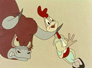 Manolin removes the real bull’s horns, holding them like a telephone receiver, and “dials up” the bull by spinning the bull’s eyes like an old rotary-dial phone. He tells the bull that they must now ready themselves for “the kill’, and to make it look good. Suddenly, Manolin spots the floating Burrito and Crow on the sidelines. “Hi, Burrito”, waves Manolin – then turns green at the realization that Burrito can’t be in two places at once. All games are over, as Manolin runs, cringing with his back against the wooden barrier under Burrito and Crow, awaiting his fate as the bull prepares to charge. To save the situation, Burrito does some quick thinking and moving, grabbing the collars of both Crow and Manolin with both hands, and mixing them together in a whirlwind blur. In an instant, costumes have been switched, and Crow finds himself standing before the wooden barrier, dressed in Manolin’s torero outfit. Whoever wears the suit receives the charge, and Bull hits Crow full force, busting a hole right through the barrier, the arena fence, and the bull ring wall, and charging off down the nearest road in close pursuit of Crow, over the horizon. Manolin and Burrito look on through the hole in the wall, then Burrito gives Manolin a stern glance, as if to say, “See? I told you so.” Manolin bushes red with chagrin, but finally offers Burrito his extended hand, and the two patch up their differences with a firm handshake of friendship, for the fade out.