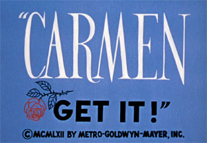Carmen Get It (Rembrandt Films/MGM, Tom and Jerry, 12/21/62 – Gene Deitch, dir.) – The last and one of the best of Gene Deitch’s season of producing Tom and Jerry shorts on a farm-out basis for MGM. A chase through the busy city (including past a visible Loew’s and Apollo theaters) brings Tom and Jerry to the Metropolitan Opera house, where the orchestra is warming up for an evening production of “Carmen”. While Jerry is able to slip in unnoticed, Tom has to resort to subterfuge to get past security, obtaining from nowhere a tuxedo to mingle among the orchestra members, and also obtaining from heaven knows where a giant bass fiddle case to carry inside. Inside the case is a series of multiple smaller cases for stringed instruments (arranged like a Russian nested doll), the last housing a mere violin – but a special one. Concealed inside its woodwork is a tape recorder, with a tape spooled up with a complete recording of the violin part for the Carmen score. Tom won’t have to worry about his lack of musical ability in order to stick around and hunt down Jerry.