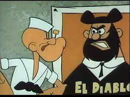 Also from Larry Harmon is “Bullfighter Bully” (King Features, Popeye, circa 1960 – Paul Fennell, dir.) – At least by this time, Harmon’s animation staff had picked up the quality levels, so the visuals are on a rough parity with middle-level competition. But the film oddly starts out with a glaring soundtrack error, as the stock Popeye theme is not cut into the track on cue, leaving Popeye’s pipe toots about a half-second delayed from their usual rhythm with his theme. “El Diablo” here becomes the name assigned to matador Bluto, rather than the name of the bull. Popeye is not impressed with Bluto’s image on a poster outside the arena, and tweaks the nose of Bluto’s image thereon. “And this is for you, Senor” is heard from behind Popeye, as the fist of Bluto clobbers Popeye down for the humiliation. Bluto kisses Olive’s hand, and declares that he will kill the bull today just for her. Olive wants to go in to watch the bout, but Popeye voices his resistance to the idea, not wanting to see a big bully picking on a bull. Of course, Olive wins this dispute, and Popeye is dragged along, despite stating he can take it or leave it. Olive spots a bovine in a holding pen, and thinks it is the bull, but Popeye points out that it is only a little calf, and steps close to the pen, receiving a few friendly licks on the face from the calf. Olive and Popeye finally take their seats, but Popeye states he hopes the bull wins. As Bluto bows to the crowd, Popeye shouts, “Hooray for the bull”, and pitches a raw egg in Bluto’s face.