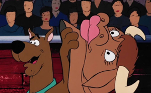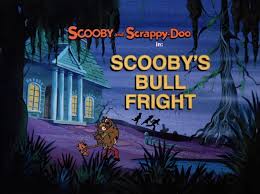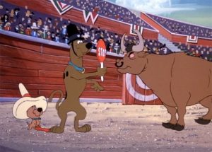 With the Mystery Machine’s ignition still not cooperating, our heroes attempt to make a getaway, disguised in an old cow hide. As in any bullfight cartoon, the bull is smitten by the fake female, but a kiss from him is more than Scooby in the fake cow head can stand, who reveals himself to spit away the flavor and say “Yuck”. Scrappy somehow winds up inside the head, and still utters verbal challenges to the bull, charging him, and dragging Shaggy and Scooby along in the rear of the costume. Roles become reversed, as the bull picks up a cape, and plays toreador for a pass of the charging Scrappy. Scooby and Shaggy crash into a wall, while Scrappy breaks free of the head, and leaps on the bull’s back, seeking to ride him as if in a rodeo. The bull begins to buck, but Scrappy remains astride him. Shaggy and Scooby duck out of the galloping bull’s way, as Scrappy leans over the top of the bull’s head. “You still wanna play games, eh? Well try this one.” He leans over the bull’s brow, using both front paws to shut the bull’s eyes. “Guess who?”, he says. Unable to see, the bull charges through an arena archway, and a loud crash is heard within. Scooby and Shaggy presume the worst, but Scrappy emerges from the archway unharmed, leading the bull, who is bandaged and in traction. The boys find themselves strewn with roses tossed from the stands, and Scrappy still wants more. “We can’t quit while we’re ahead”, he declares. “That’s what you think”, answers Shaggy, as the Mystery Machine’s engine finally turns over, and the three speed off into the Mexican sunset.