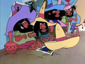 A quick costume change plays on an old gag from Bugs Bunny’s “Super Rabbit”, as Quick Draw appears mistakenly in a clown outfit instead of the proper cape and mask. Once wardrobe problems are resolved, Tabasco receives his first introduction to Kabong’s “Kabonger” – over the head. “He is dangerous”, Tabasco admits. Even making an escape in a stagecoach provides little protection, as the Kabonger is extended to the moving stagecoach’s window on a telephone extender to strike another blow. But the matter remains that the debt of ten thousand pestardos still needs to be paid, and all Kabong has in his pockets is $1.35 and half a Green Stamp (far insufficient, even with favorable Mexican exchange rates).
