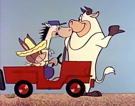 Mumbly open the competition for the Really Rottens – as usual, with a plan to cheat. He has with him a sleeping gas bomb, intending to make the bull go nighty-night while he grabs the rose. But the device doesn’t work as intended when tossed, merely bouncing off the bull’s nose without emitting its contents, and rebounds back to Mumbly’s feet where it finally bursts open. Mumbly yawns, falls into a sleepwalk, and walks himself out of the arena in a complete doze. Dynomutt steps out as the representative of the Scooby-Doobies. Hos gimmick: use his bionic leg extensions to obtain an overhead position on the bull, sneaking up from behind to pluck the rose from a position right between the bull’s eyes. The bull, however, spots him on the first attempt, and dodges forward into a run across the arena before Dynomutt can make the grab. With his feet still planted where they started from, Dynomutt attempts to keep up with the bull not by running, but by continuing to extend his telescoping lower limbs. He runs out of extension room, reaching his maximum limit, and is sprung backwards by his mechanical limbs, which land hard upon his feet, compressing him into a short squat stance back where he started. Dynomutt apologizes that he must have strained a transistor, and waddles slowly away. This leaves the surprise contestant chosen to represent the Yogi Yahooeys – Cindy Bear! Commentators Snagglepuss and Mildew Wolf can’t figure how she ever expects to get near enough to the bull to do anything – especially when, instead of a cape, Cindy produces a music stand and sheet music. But Cindy promises that music has charms to soothe the savage beast, and the tune she intends to perform will have the bull dropping the rose right at her feet. The bull begins a charge, and Mildew observes that he doesn’t look like he’s got any ear for music. But Cindy stands her ground, and must have been taking lessons from Quick Draw McGraw (making one wonder why Quick Draw wasn’t chosen as team representative to repeat his performance discussed above, since Quick Draw is also a regular member of the Yogi Yahooeys team), performing a run of high-piercing, off-key contraltos. Her singing has the same effect upon the bull as Quick Draw’s, with the bull stopping just short of impact to plug his ears with his hooves, his jaw dropping open in a “no” position, and the rose landing right at Cindy’s feet as promised. (Odd in retrospect, since Cindy sang quite competently in “Hey, There, It’s Yogi Bear”, and “Yogi’s First Christmas”.) Mildew loses a bet to Snagglepuss that Cindy couldn’t do it, and is required to eat his straw hat, complaining that it’ll spoil his din-din – but please, pass the ketchup.