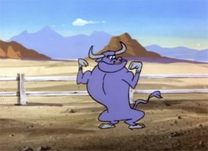 Bull-Leave Me (3/7/60) finds Quick Draw in a new setting – on the pampas in the Argentine. A prize bull, named El Screwballito, has escaped, and a gaucho is in pursuit to re-capture him. The bull features a delightful resonating basso chortle of a laugh, that is reminiscent of the laugh of Tex Avery in such films as “Hamateur Night” and “The Penguin Parade” – a bit of a surprise it doesn’t show up in more H-B films, in place of Don Messick’s ever-present snicker for dogs such as Muttley and Mumbly. A narrator asks the bull why he ran away, and, after a laugh, he responds, “Ees fun!” The gaucho throws a set of bolas at the bull, but the bull acquires from nowhere a baseball bat, and bats the bolas back to the gaucho, tying him firmly up. The gaucho points out how well the name “El Screwballito” thus fits the bull.