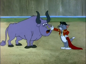 Jerry becomes practically a non-participant in this cartoon, appearing in the ring only as an assistant to carry Tom’s capes (we never see a sword, so one can only wonder how any match is supposed to end). Toro is released from the opposite door of the arena, and begins giving his horn-turning signals. Tom pulls a few of the standard cape maneuvers, including the old windowshade roll-up as Toro passes. Tom uses one new move, hanging the cape upon his tail for another pass. Toro looks back to observe that the crowd is loving it – but overshoots the parameters of the arena, sliding through the archway of the matadors’ entrance, and crashing into a wall inside. He is not only temporarily dazed, but comes up with a twisted ankle. The show must go on, declares the arena owner, making a call for a substitute – El Rotteno. The angry substitute quickly recognizes Tom as the wise guy with the red dress, and seeks to even the score. Tom, however, is none the wiser about the substitution, and calmly walks up to the bull, clasping the metal ring hooked in his nose, and raising and lowering it a couple of times as if using a door-knocker. El Rotteno charges, and two old Warner gags are quickly swiped by the writers. First, a pass transforms Tom’s cape into a string of paper dolls (straight out of Daffy Duck’s “Mexican Joyride”). Then, a second cape handed to Tom by Jerry is punctured with a bull-shaped silhouette (from “Bully for Bugs”). Tom smiles through it all, still thinking it’s part of the act (though no explanation is provided as to why Tom is not looking for the twirling horn signals expected from Toro). As for Toro himself, he suddenly appears above Jerry on the sidelines, watching the match from the spectator’s side of the fence. Toro thinks Tom is doing all right for himself – but explains to Jerry about his twisted ankle, and that Tom is really fighting El Rotteno. Jerry, maintaining his inability to speak, quickly scribbles a note of explanation to Tom, runs up Tom’s back, and displays the note before Tom’s eyes. El Rotteno makes another pass, catching the note on his horns, then slashing one horn against another to cut the paper into confetti. Tom runs for one of the picador barriers, climbing it. El Rotteno again slams his horns into wood, but this time exerts his strength, lifting the barrier out of the ground, and carrying Tom along on top of it with him. He then spots Jerry, and starts to chase him too. Atop the bull, Tom grabs the points of the bull’s horns protruding through the barrier, and steers them to the right to change the bull’s direction. El Rotteno is steered through the archway back to the bull enclosure, and the wooden barrier falls into place at the archway, very unconvincingly providing a supposed barrier to the bull’s re-entrance. (It’s not mounted to the wall by anything, so couldn’t El Rotteno merely knock it down?) The film abruptly ends without further development, in a traditional scene of T&J taking bows as sombreros are tossed into the ring. Ho Hum – and this was one of the better installments of the series!