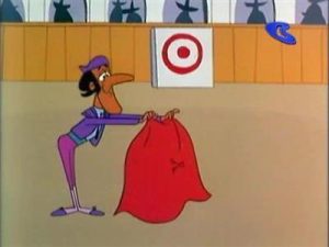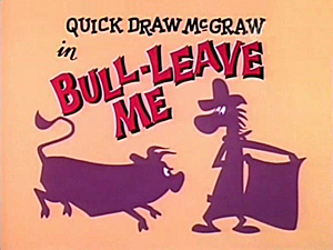 As usual, Hanna-Barbera was always a major contributor to standard cartoon scenarios and settings, tried and true by studios for years, which would find regular reuse in their seemingly-endless stream of production of films for TV. Of course, bullfighting thus became a common fall-back for situation comedy. Previous comments and posts have already addressed Bullfighter Huck, and Yogi Bear’s Big Bad Bully. We thus pick up with the sadly-neglected third member of H-B’s original triumvirate of animal icons, Quick Draw McGraw, who provides two episodes of interest, then proceed ahead into other series with bullfight action overlooked by our readership.