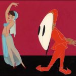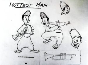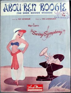 Abou Ben Boogie (9/18/44) contains absolutely no plot – and makes no pretense at being anything but Lantz’s attempt to do an all-out “homage” (or is the proper word, “steal”) of the night-club girl watching of Avery’s Red Hot Riding Hood). Since the film is essentially a comeback for the designs of the Princess and the fastest man in Siam, from The Greatest Man in Siam, the locale is shifted to an unknown nation in the middle East, at a night spot known as the Adobe Club (“Here’s mud in your eye”). The princess is recast as the entertainment, appearing out of a giant magic lamp, while the former fastest man appears as Abou Ben Boogie, the oriental rug cutter. No effort is made to not copy the Avery style, with wild takes galore (including Avery’s own giant-eyeball once-over of the girl), and substantially smoother and more seductive animation of the girl’s title number than anything seen in “Siam”. In fact, there are artifacts that suggest the film got in trouble with the censors (who had already required the girl to at least wear transparent harem-leggings in the prior picture), as several walk-cycles are seen only from the waist up – a likely indicator that the censors made the shots be zoomed-in upon to remove view of sensuous hip-strutting. It is surprising this film is not better-known and regarded among animation buffs for its similarities to the Avery product – something that often catches the eye when appearing in the work of other studios, such as Famous’s Sheep Shape – and, alas, may be mainly due to Universal keeping the film under wraps for so many decades. The title number, with writing credit given onscreen to Tot Seymour and Vee Lawnhurst, is an original, of which I am aware of no commercial recordings. However, the piece was published by Leeds Music, with a colorful and seductive piece of original artwork based on the film.