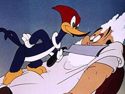 Storywise, Woody harasses several circus animals, including getting back at a lion who takes a bite of his hot dog by having the beast bite off his own tail (“Just call me stubby”). He then tries to enter the big top without a ticket. A roustabout boots him out, then insists that he work for it by watering the elephant if he wants to see the show. Woody short cuts with the old gag from the silent days of hooking up the pachyderm’s nose to a fire hydrant. The roustabout vows, “When I get through with you, any similarity between you and a woodpecker will be purely coincidental.” The chase leads inside, where Woody takes to the trapeze, swinging at times from his topknot, and scatting several bars of a middle movement of “The Blue Danube”. The roustabout is forced to perform a harrowing bicycle ride down a steep inclined ramp, gaining so much speed that he straightens out the loop-de-loop in the wooden structure. Both characters end the film outside within the shooting gallery booth, dodging shot and shell. Though there were many better Woody films produced over the years, this one bears the unexpected distinction of being the only Woody cartoon ever nominated for an Academy Award.