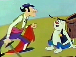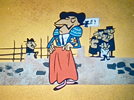 Turning back the clock again to the 1950’s, UPA’s The Boing Boing Show included a bullfighting episode entitled The Matador and the Troubadour (circa 1956?). Only a foreign-language print without subtitles is currently available online, so I can only give details beyond the visuals from memory of a prior screening recorded on VHS which I cannot readily lay hands upon. It tells a simple tale of a village where the local matador reigns supreme in the eyes of the villagers – and especially, the ladies – in popularity, while a small, lonely troubadour strums his guitar alone in the streets, virtually unnoticed (except by a rather plain and homely village girl, who is the only one charmed by his plaintiff ballads). The troubadour believes he has all the moves and grace to match the matador, and indeed is shown in a side-by-side performance behind the matador’s back, matching his every move in miniature. Thus, the troubadour begins training in secret to learn all the passes of the matador, with the local girl assisting by charging at him with a set of bull horns attached to the head of a wheelbarrow. The film attempts to be slightly educational, naming in Spanish several of the passes he perfects, but ending with something that sounds like “El Paseo Ridiculoso” – a move that gets the Troubadour completely wrapped up from head to toe within his own cape.