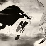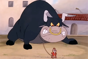 A whole article has been devoted by the columns of Dr. Toon on this site to the story and history of Toei Animation’s feature-length Saiyuuki, or Alakazam the Great (8/14/60) (as known to American audiences), and its checkered editing and translation in attempt to make its material palatable to the U.S. market. I thus won’t go into its sometimes unfathomable plot about a magical monkey king, his fall from grace by challenging the gods, and his lengthy pilgrimage with a ragtag band of friends to achieve humility. However, it is odd that it has been forgotten by the readership here, as its climactic sequence develops into a full-blown bullfight with an evil bull-demon who resorts to his roots, transforming into a humongous and pure-animal version of the bovine beast for a savage showdown with Alakazam. Alakazam himself produces a red cape, and adds something no other animated depictions of the sport have included – the decorated banderillas, spear-like poles, used to puncture the bull’s shoulder muscles and weaken him. To make things a little more magical, the battle occurs in mid-air, both characters defying gravity (Alakazam doing so by taking up his matador positions while standing atop a floating cloud, while the bull needs no cloud to gallop airborne at will), with both of them hovering over a volcanic lava pit. The bull action is rather traditional to the moves of the ring, with graceful passes, and multiple spears placed into the bull’s back. (It’s hard to tell if the animation shows primarily red paper streamers upon the spears, or if there is some suggestion of bloodletting from the wounds.) It seems unclear what is the fatal blow or cause that finally sends the bull tumbling from the sky into the lava pit. Strangely, one of Alakazam’s companions, a large pig in a kimono who provides most of the comic relief, is in possession of a magic fan which can freeze things in its path. He chooses at this moment to wave the fan to stop the lava flow, freezing the lava and the mountain peak in ice. So we may never really know if the bull demon burned to a crisp in the volcanic molten rock, or merely was placed into a deep freeze.