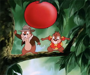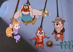 Chip, Gadget, and Zipper console Monty, and assure him that, with their unified help, they can better the odds against the villain. But there’s still the matter of Dale. Dale is still outside, thinking the bull is paying possum and just trying to mess up his show of heroism. Dale tries to lasso the bull and drag him off with a rope, but still can’t budge him. Chip emerges, trying to get Dale to follow them inside, and insisting that Dale can’t do the job all by himself. The two chipmunks get into one of their usual verbal debates, while the bull comes to. It is not long before they are both cornered against a wall. Gadget meanwhile has been engaging in her own specialty – trying to construct a mechanical contraption out of the debris in the storage shed, with Monty’s help. They discover upon looking outside that their help may be too little and too late to save their chipmunk friends. But one team member is neither too little nor too late. Little Zipper the fly hits upon an idea, and zips straight into one of the bull’s ears. The bull becomes entirely distracted, pawing at his ear and trying to hit his head on the side with the opposite hoof to get the proverbial bee out of his bonnet. The diversion does the trick, and Chip and Dale join the others inside the shed as Zipper also flies through the crack in the door, leaving the gang in temporary safety.