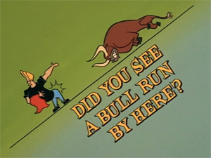 • A flipped version of “Did You See a Bull Run By Here?” is on a block of Johnny Bravo cartoons on Dailymotion, beginning at 1:14:23.