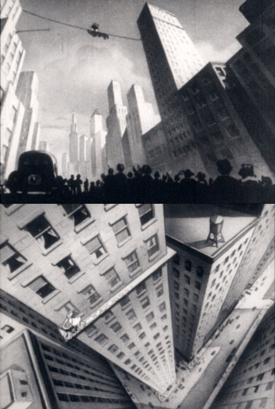 It’s a beautifully layed-out picture featuring some beautiful shots of New York Skyscrapers. Terrytoons don’t often get noted for their backgrounds, but they really should since there’s so much beautiful layout and painting work in these shorts.