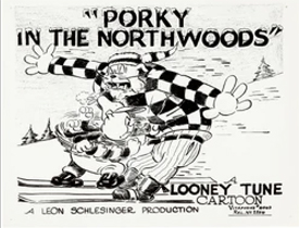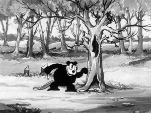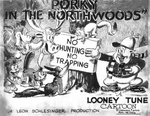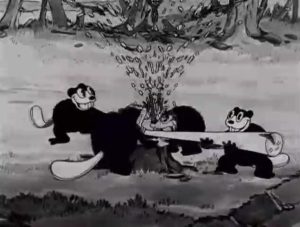 The trapper is finally revealed as one Jean Batiste – a large, burly, lumberjack-style dog. He easily traces the tracks back to the ranger station, and walks in on the line waiting for Porky’s ironing. Grabbing the iron, he uses it without the aid of insulating towel directly on Porky’s tail, straightening it like a dart, then sticks the rigid tail into the table woodwork, suspending Porky above it, to be punched back and forth like a punching bag. He throws Porky across the room, his tail again piercing the wood of the cabin wall like a dart, placing Porky’s rear end over the escaping hot steam of a whistling tea kettle atop Porky’s stove. Then, Batiste pulls out a sled dog whip, and removes one of his snowshoes. He lassoes Porky with the whip, pulls him out of the wall and back to him, then smacks Porky with the snowshoe, bouncing him off the wall like a tennis ball, and playing a painful one-man tennis game with Porky taking all the hits. Beaver #2 sees all this happening from the doorway, and again retraces his previous steps through the six scenic backgrounds at super-speed, finally coming to a stop below a fuzzy hanging object above, which he pulls. It is the goatee-like fur hanging from the throat of a giant moose, who bellows out a low-pitched wail as an alarm of distress to the forest. In several shots of fine animation detail, rows of bears come charging out of caves, skunks from within trees, a parade of snapping turtles tapping a beat on their shells with drumsticks as a marching band, and of course, hundreds of beavers from dens in the river bed. They converge on the cabin just as Batiste has succeeded in knocking Porky cold. Jean prepares to leave the cabin, but quickly spots the approaching stampede, and tries to bolt the door. No matter. The animals smash it down. Jean speeds out of a rear exit on skis. It’s time to “give him the works” again. Two bears launch the beaver twins at him via crosscut saw catapults, and they slap his head around with their tails as well as wooden sticks. The turtles slide between Jean’s skis, beating his bottom with clubs as they pass under. More beavers launch a barrage of small logs at the back of Jean’s head via slingshots rigged into the antlers of moose. The skunks also launch fitting weapons from their tails – smelly, rotten eggs. Finally, the beaver twins pull the old vine-across-the-path trick, tripping Jean and launching him skyward and off the mountain slope. Jean begins to descend, upside down, and his skis act like whirling propeller blades, spiraling him into a twist, so that he screws himself firmly into the snow-covered ground below, only his ankles and skis left protruding from the snow. The revived Porky, who seems to have recuperated entirely, joins the animals in cheers of victory – then smile at observing what the beaver twins are up to. They have taken advantage of Jean’s downfall and present position, by converting his inverted skis on Jean’s ankles into their new playground attraction – a see-saw (an ending likely “borrowed” from Morty and Ferdie’s similar see-saw atop Mickey Mouse’s head in Mickey’s Steam-Roller of a few seasons back).