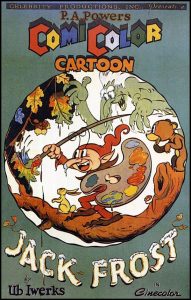 Though Ub Iwerks may have invented the animated beaver, he didn’t find much opportunity to use him in productions from his own cartoon studio. What appears to be the only such instance was a brief cameo shot in Iwerks’s wintertime classic, Jack Frost (ComiColor, 12/24/34). A forest full of various animals opens the first shots of the film, cavorting in a public game of leap frog (no, Flip is not a participant). A small bear is the first to notice an observer on a tree limb, with the mere utterance of his name drawing the undivided attention of the forest folk. A magical elf, by the name of Jack Frost, has appeared, carrying a paintbrush and artist’s palette, with which he performs magic by changing objects’ color and appearance to render them harbingers of approaching Autumn. He is seen painting the green leaves into orange and brown hues, and calls down an advance warning that summer’s gone, and Old Man Winter will be knocking at their door. Better get their food and nuts stored away. A dancing quartet of beavers responds, “Thanks, Mr. Jackie for your advice. We’ll hurry home to our wives”, while various squirrels complete the rhyming couplet by stashing nuts in their trees, and stating that they’ll “have their cupboard filled with supplies, when Old Man Winter Arrives.” That’s all the beavers get to do. The rest of the film follows the misadventures of a determined grizzly bear cub, who thinks he’s too tough to have to worry about winter cold thanks to his furry coat, and doesn’t want to hibernate like his parents. When the cub ventures out into the forest, Old Man Winter locks him away inside a hollow log with a row of icicle bars to block his exit. But Frost takes pity on the disobedient cub, and uses his paint magic to change the ice bars into peppermint sticks, allowing the cub to lick his way to an escape. Jack flies the cub home, tucks him in to sleep, then writes in frost upon the window as he exits, “Finis”.