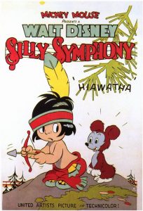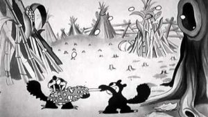 Little Hiawatha (Disney/UA, Silly Symphony, 5/15/37 – David Hand, dir.) is a forest masterpiece that certainly earned director David Hand the future right to be supervising director of “Bambi”. It tells the tale of Longfellow’s mighty Indian warrior – when he was just starting out as a tiny boy, out for his first day of solo hunting in the woods. He is capable enough in rowing a canoe, but has a lot to learn when it comes to bringing back prize game. Try as he might, he can’t get close enough to the animals to take a shot with his small bow and arrow, as they keep running out of range. The only two creatures who stay still long enough for him to aim are a grasshopper (who proves himself the better marksman by spitting in Hiawatha’s face), and a tiny baby bunny, who is too inexperienced and becomes cornered atop a tree stump. Hiawatha shouts, “Yippee” and aims his bow. The bunny, however, turns on him a set of what Charlie Dog at Warner Brothers would have called the “big, soulful eyes”. Hiawatha starts losing his nerve to go through with it, sniffles, and sheds a single tear. He then gets hold of himself, and decides to make it a fair fight, reaching into his Indian trousers (which, by the way, someone really needs to buy him a belt for – as the running gag of the film has his pants falling down at least seven times!) and pulling out a matching bow and arrow with which he arms the bunny. Positioning himself and the bunny back-to-back, he paces off five steps in duel fashion, turns, and pulls back his bowstring to fire. The bunny, however, is no opponent, having no idea what to do with the weapon, which drops out of his trembling hands. Frustrated, Hiawatha kicks at the dirt, shoos the bunny away to his waiting parents, then breaks his bows and arrows across his knee. He’s given up picking on the little guy. This reaction brings cheers from the creatures of the woodland, embarrassing Hiawatha, who shyly backs out of the scene.