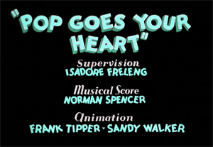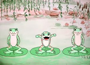 Either competing studios were blown away by the Disney efforts above, or just for unknown reasons were slow to adopt the beaver into their animation models for various forest-related cartoons of the period, as, for a few more years, no beavers seem to turn up in cartoons I’ve been able to discover. I again could be overlooking something, as reference to beavers rarely turns up in the titles of episodes, so if anyone remembers any other early beavers, feel free to comment. Harman and Ising seem to have missed their opportunities entirely, choosing not to include beavers in such possible vehicles as “Ain’t Nature Grand?”, “The Trees’ Knees”, and “Bosko’s Woodland Daze”. But, as Leon Schlesinger began to shift the Merrie Melodies series to color, we get Pop Goes Your Heart (Warner, 2-strip Technicolor, 12/8/34 – Isadore (Friz) Freleng, dir.). In essence, this is Friz’s idea of a Silly Symphony, considerably behind the times, and resembling something Disney might have produced several years before. It is another plotless romp in nature, with the likes of humming birds and humming bees, a papa grasshopper teaching his young ones to spit with chewing tobacco, turtles learning to swim by flipping over on their backs and stroking with reeds like a rowing crew, and some harp-stylist spiders playing the title tune on the strands of their web, while worms inside two apples simulate the limbs of a pair of dancers, and a trio of croaking frogs sings the lyric. (The song, by the way, was a semi-hit from Dick Powell’s feature, “Happiness Ahead”.)