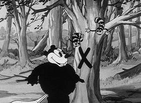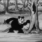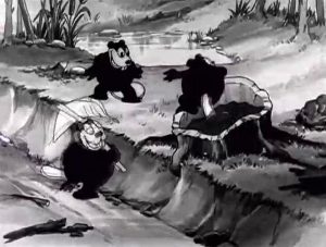 The beavers dance atop a dam under construction in the foreground, tamping down lumber into its structure with their tails, while several other small groups of beavers are seen in the stream, constructing beaver dens with entrances below water. Two beavers dance together in synchronized rhythm along the bank, then chew down a small tree, which topples onto the head of one of them. In the later climax of the film, as the first cold blasts of winter wind are felt, one beaver calls an alarm to the others, and one-by-one, several beavers dive into the water and are seen as bulges and vibrations within the structure of a beaver den, having entered it from below. A stranger appears – a misguided duck, who doesn’t have the good sense to fly south, and instead also dives under the water, attempting to join the beavers in their comfy abode. He is quickly and rudely ejected, swimming away with complaining quacks. The skunk looks for shelter, but gets hit with a back of porcupine quills from inside one tree already occupied – so moves into another one, sending all of its furry occupants scattering for another tree next door. The crows get the final shot, taking up residence inside the hollow clothing of the scarecrow. One small crow is left out, and kicks the pantleg of the trousers, hoping for access. In an ending which nearly duplicates that of “The Skeleton Dance”, the bony foot of one of the crows reaches out from the drop-seat of the trousers, yanks the little crow inside, then re-buttons the drop-seat.